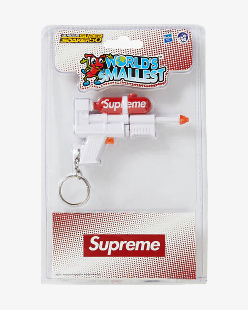 Released as a part of Supreme's Week 17 drop, Supreme collaborated with water gun company, Super Soaker, on what can be considered to be their second toy release of the year. Debuted in 1990, the Super Soaker 50 was Super Soaker's very first water gun and was one of the very first pressurized water guns ever made. The Supreme Super Soaker 50 keychain is the smallest water gun in the world which actually works!
