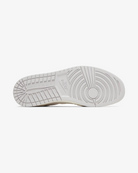 The Air Jordan 1 Mid Inside Out White Grey presents a unique spin on the classic Air Jordan, with the body of the shoe featuring a variety of neutral colors and different fabrics. The Nike symbol on the side appears in white, with subtle red details. The laces are a buttery cream color and sit on top of a light pink tongue.