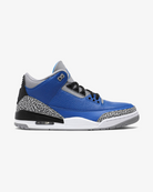 The Jordan 3 Royal Cement features all-blue tumbled leather uppers with grey perforated leather inserts by the laces and ankle. Traditional Jumpman insignias cover the heel tabs. As its name alludes, the Royal Cement features Cement print overlays around the toe and heel that provide its signature appeal.
