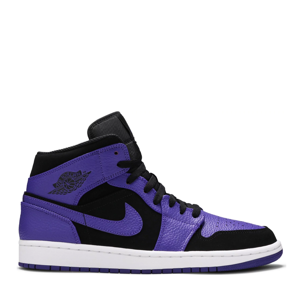 The Air Jordan 1 burst onto the scene in 1985 and quickly became iconic as the famed athlete's career soared. With a mid-top silhouette following in the early 2000s, this December 2018 'Dark Concord' edition is remodeled with original details and fresh materials. Purple tumbled leather is layered over black nubuck on the lateral sides. Classic Wings and Jumpman insignia rest on the ankle and tongue. Air-Sole cushioning and a rubber cupsole provide durability and comfort.