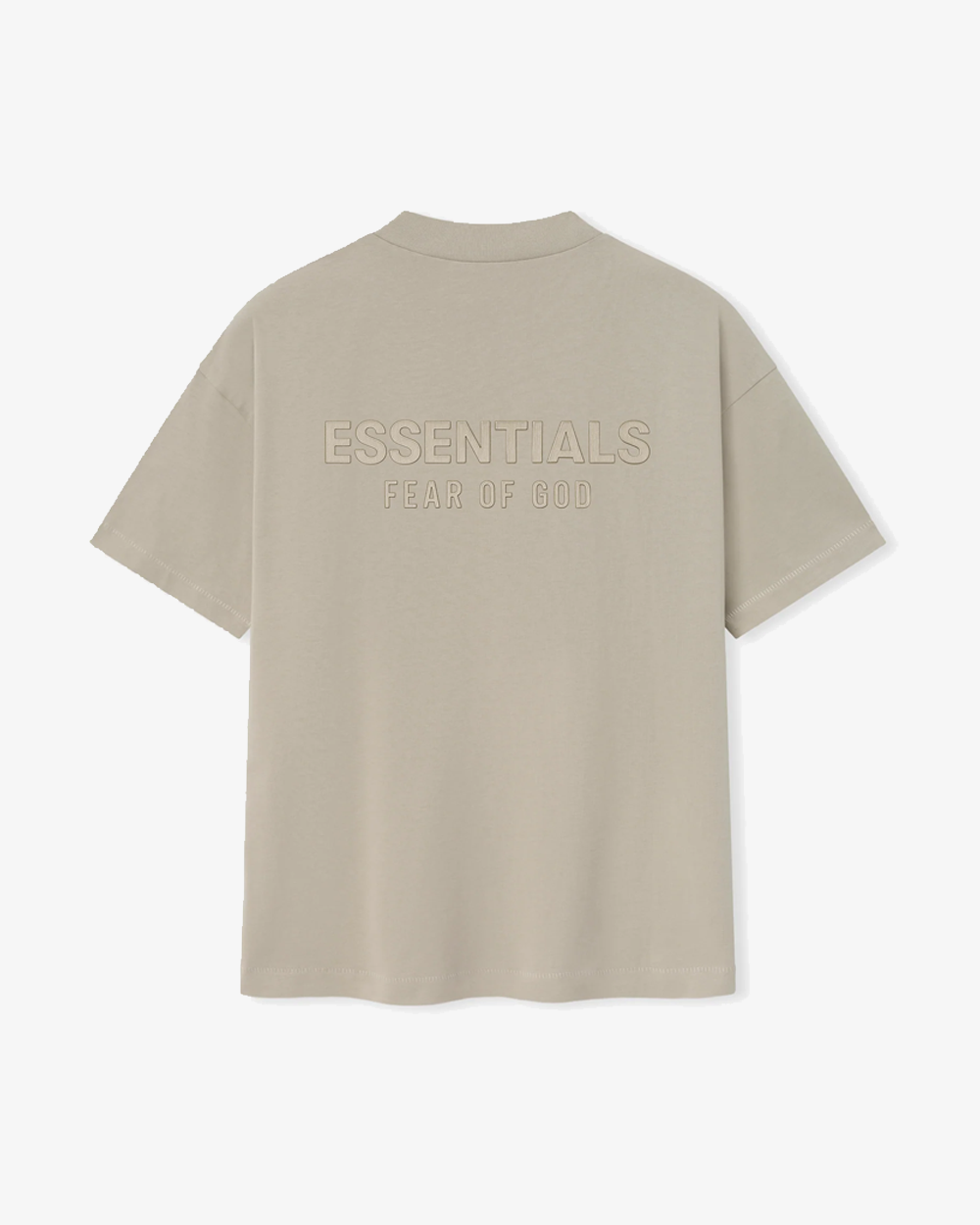 The Classic Tee is made from medium-weight 100% cotton jersey. The rib-knit crewneck tee features a classic fit with signature Fear of God relaxed proportions for everyday wear. Branding includes a "Fear of God Essentials" translucent rubberized label at the center front and a new "Essentials Fear of God" beveled metallic logo across the back.