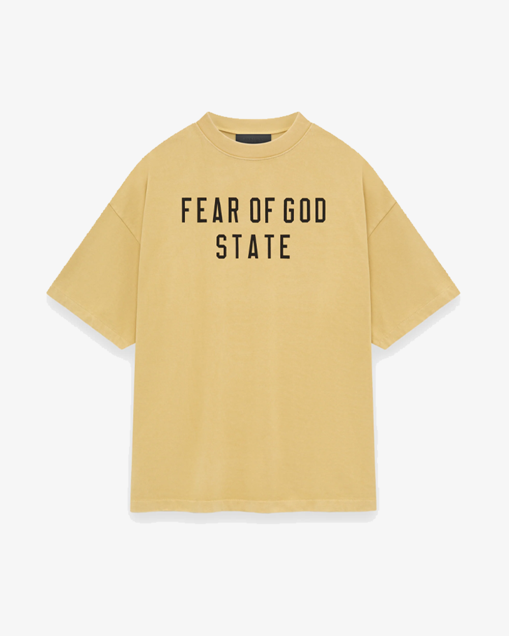 The Heavy Crewneck Tee is elevated in a 380-gram heavy cotton jersey to provide pronounced weight and structure. The rib-knit crewneck tee fits relaxed in the body with dropped shoulders. A collegiate-inspired "Fear of God State" graphic is screen printed on the center front, and the Essentials Fear of God rubberized label is at the back collar.