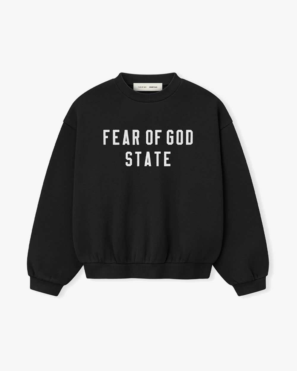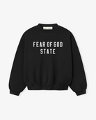 The Kids 90's Fit Crewneck is made from 380gsm core fleece to provide ideal comfort and structure. The piece features a 90s fit with oversized proportions and dropped shoulders. A "Fear of God State" satin twill lettering is branded across the front. Details include rib-knit collar, cuffs, and waist-hem. A Fear of God Essentials rubberized label is stitched at the back collar.