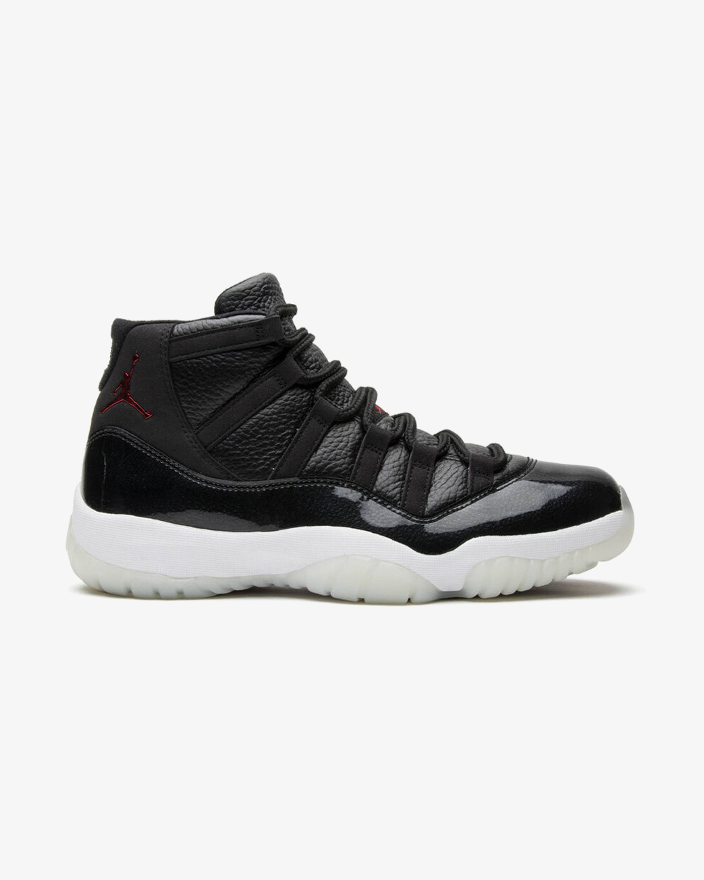 The Air Jordan 11 Retro 72-10 introduced a minimalist design with transparent outsole, clean white midsole, and the patent mudguard that defines the Jordan 11 silhouette.