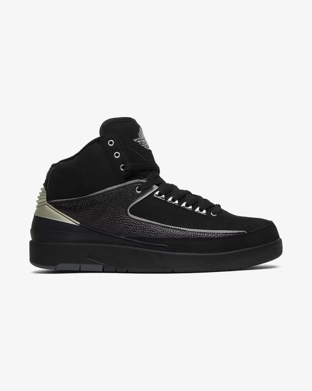 The Air Jordan 2 Retro ‘Black Chrome’ sticks to the AJ2’s premium theme, with chrome accents lining the branding, eyelets and heel panel. The nubuck construction of the rest of the upper is complemented by pebbled leather, all of which is finished in black. The ‘Wings’ logo on the tongue is also in chrome, finishing the look.