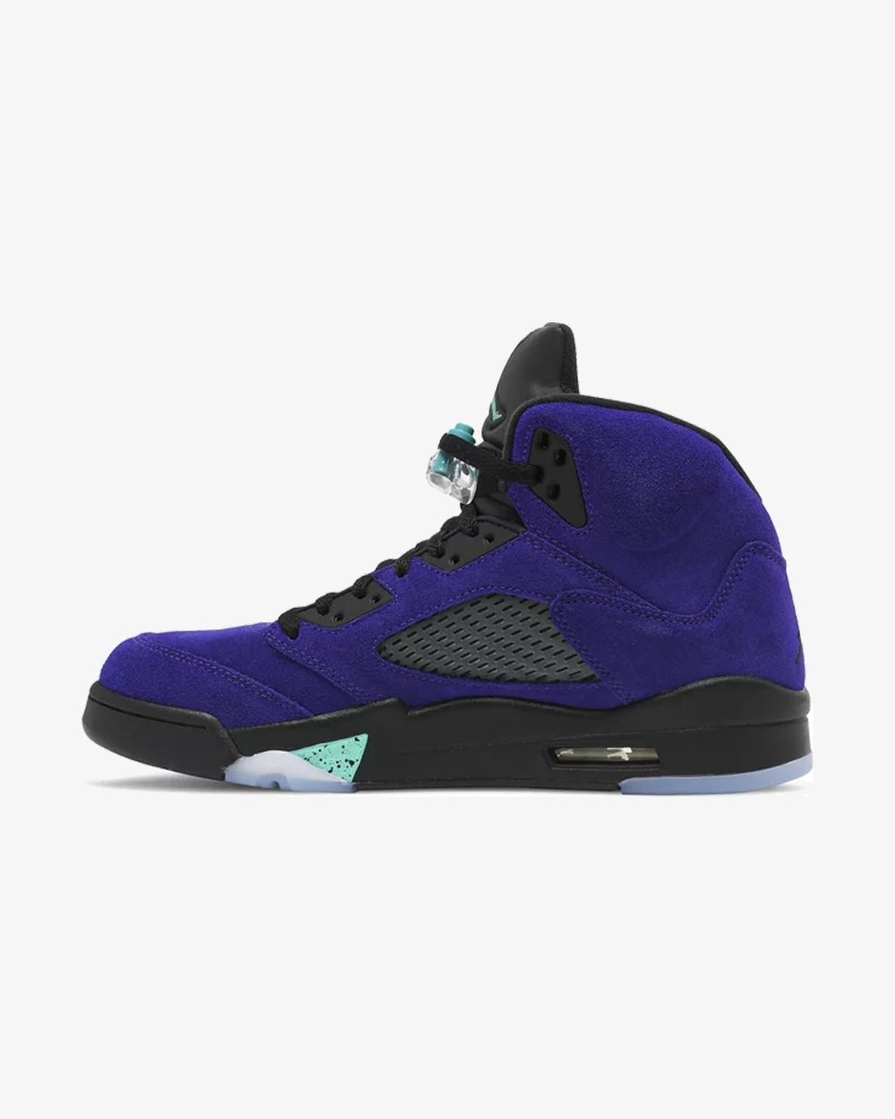 The Air Jordan 5 Retro ‘Alternate Grape’ delivers a variation on the silhouette’s classic OG colorway from 1990. The upper, outfitted entirely in purple suede, sits atop a black foam midsole with speckled shark tooth detailing in emerald green. The same hue appears on the lace locks and Jumpman branding atop the tongue, which is finished in a light-grabbing reflective finish. Additional Jumpman logo hits adorn the heel and translucent rubber outsole.
