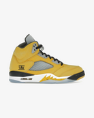 The 2025 edition of the Air Jordan 5 Retro OG Tokyo T23 revives a 2011 limited release that dropped exclusively in Japan. Like the original, this reissue sports a bright yellow nubuck upper with translucent quarter panel netting and grey molded eyelets. A Jumpman logo adorns the silver reflective tongue in black embroidery, matching the textile collar lining, stylized '23' on the lateral heel, and the second Jumpman icon that adorns the back heel.