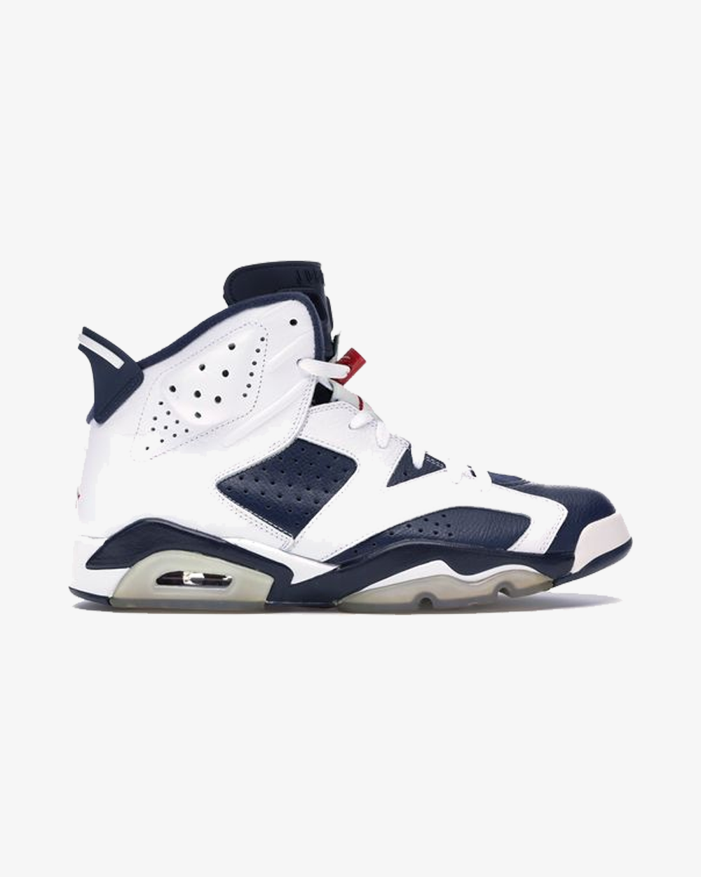 The Air Jordan 6 ‘Olympics’ were first worn by NBA-stars Ray Allen and Vin Baker of Team USA as they won gold in Sydney at the 2000 Olympic games. Released to the public in September of 2000, the sneakers retroed in 2012 to commemorate the London Olympic Games. The 2012 Air Jordan 6 Retro ‘Olympic’ sneakers differ slightly from the 2000 release with its navy midsole (instead of white) but it retains the icy blue translucent outsole and traditional Air Jumpman branding elements.