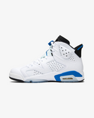 The Jordan 6 Retro Sport Blue (2014) features an upper made of white leather with perforated side panels. The shoe's outsole is made of rubber to provide grip and longevity. The midsole of these sneakers is outfitted with a visible air cushioning device for comfort and stability. The sneaker features a lace-lock system and a heel pull tab for a snug and comfortable fit. The shoe has the Jumpman logo on both the tongue and heel.