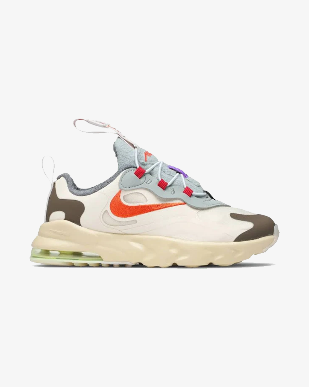 The Nike Air Max 270 React Travis Scott Cactus Trails (TD) combines Travis's love of retro clothing with an ACG-inspired color scheme from the 1990s and was the rapper’s first collaboration release with Airmax. This iteration in toddler sizing comes in patinated midsoles, orange Swoosh, and red lace locks. The sneaker comprises an upper made of mesh and seamless fabric that has an alternating pattern of cream, brown, white, and gray wavy lines in a contemporary layered design.