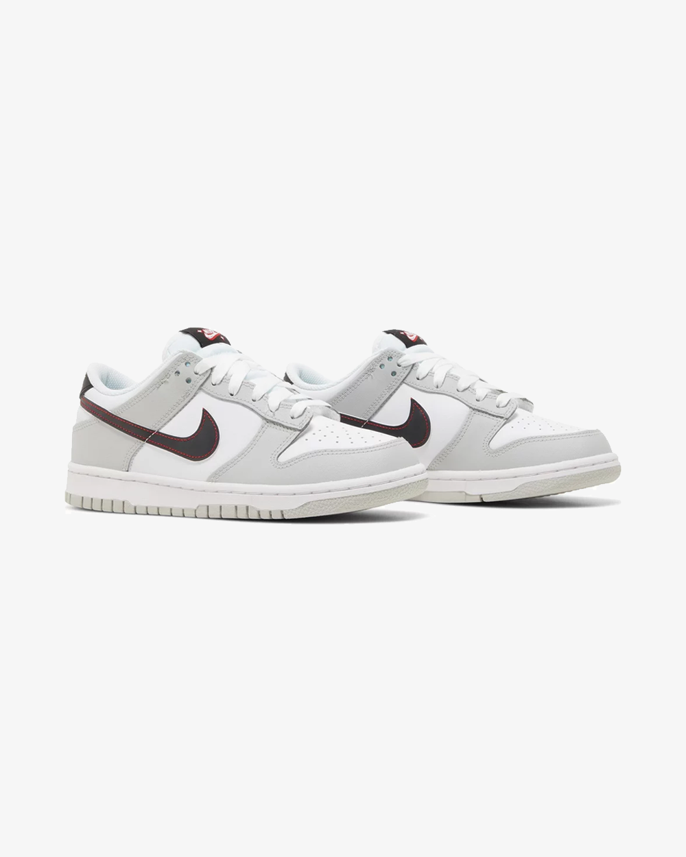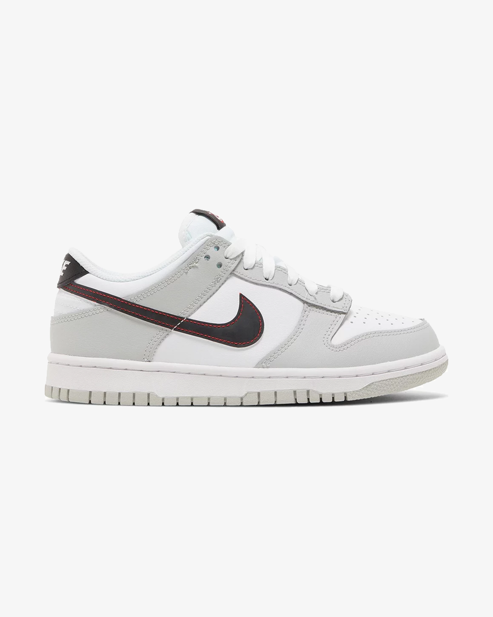 The Nike Dunk Low SE Jackpot (GS) is dressed in a Mist Gray and Light Crimson color scheme. This dunk features a white leather base with gray overlays and a matching rubber sole. Swoosh and black heels with lottery-style tongue and insole branding, special scratch-off coin tag and slot machine illustrations on tissue paper complete the design.