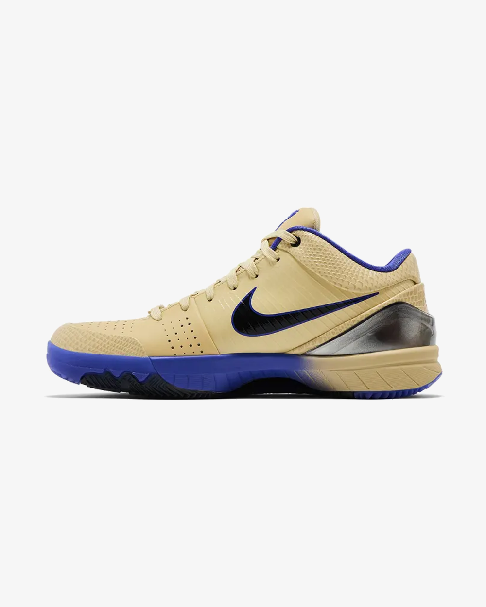 The FC Barcelona x Nike Kobe 4 Protro 'Away Kit' pays tribute to Kobe Bryant's favorite La Liga team. The low-top features a synthetic leather upper in Team Gold with an embossed snakeskin texture on the forefoot overlay and collar. Contrasting black accents make their way to the signature Swoosh and heel counter. Atop the tongue, Kobe's sheath logo is rendered in Persian Violet, matching the textile collar lining. The same hue is applied in gradient fashion to the lightweight Phylon midsole, fitted with a large-volume Zoom Air unit in the heel.