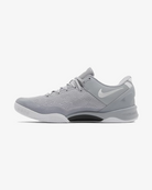 The Nike Kobe 8 Protro 'Wolf Grey' is built with grey engineered mesh, featuring a padded low-cut collar and an external TPU heel counter. Branding elements include a white embroidered Swoosh and Kobe Bryant's sheath logo on the tongue and back heel. The cushioning setup takes the form of a drop-in React foam midsole, an update from the Lunarlon midsole of the original Kobe 8. Underfoot, the herringbone-traction rubber outsole reveals a bottom-loaded carbon fiber shank plate.