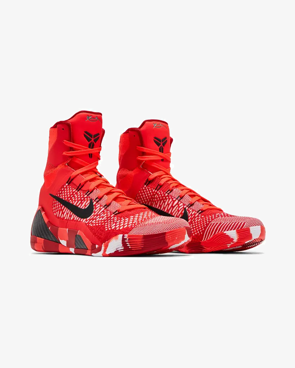 The 2024 edition of the Nike Kobe 9 Elite Protro 'Christmas' brings back a retooled version of the retro silhouette. Equipped with a dramatically high-cut collar, the crimson Flyknit upper is secured with dynamic Flywire cables for improved containment through the midfoot. A black Swoosh adorns the quarter panel, matching Kobe Bryant's shield logo atop the tongue. Black carbon fiber paneling reinforces the foam midsole, featuring a camo-like pattern in white and varying shades of red. Lightweight cushioning is provided by a drop-in React foam insole, replacing the Lunarlon foam of the original.