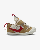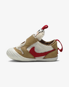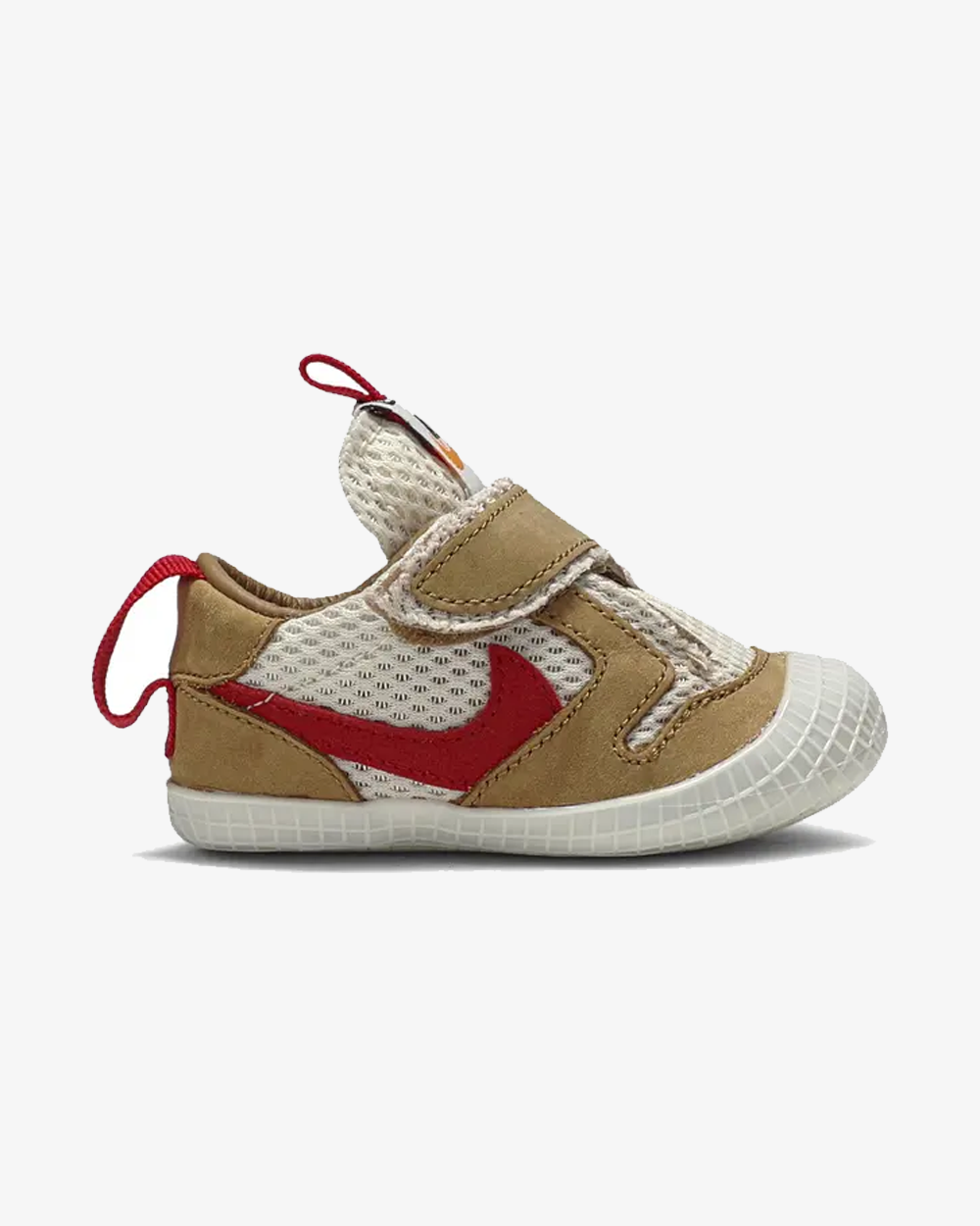 The Tom Sachs x NikeCraft Mars Yard Crib shoe dropped in October 2019 as a pint-sized take on the pair's collab from 2017. Much like the Mars Yard 2.0, this sneaker features a warp-knit tricot mesh upper in white with tan panels to stabilize. Red pull tabs make it easier to put on—a function prioritized by Sachs, whose own son was small at the time of the release. The shoe's white sole creeps up the toe for extra coverage. Each pair was originally sold in a special box with Tom Sachs branding.