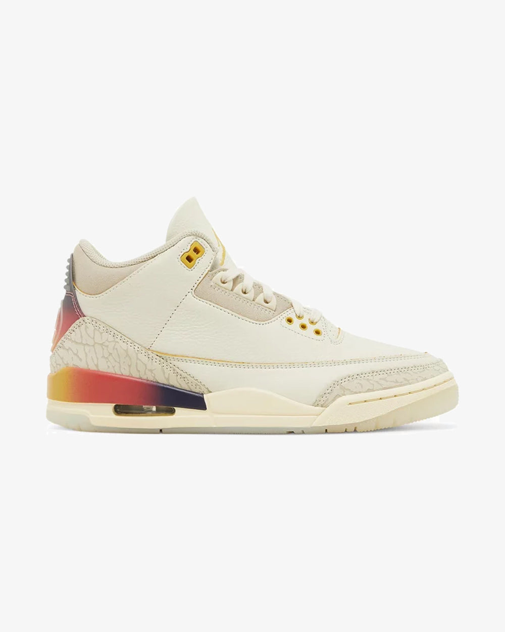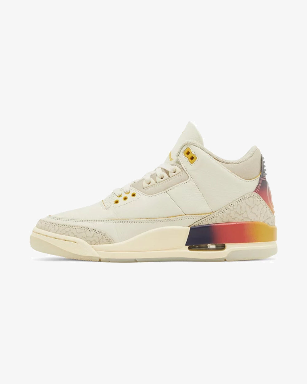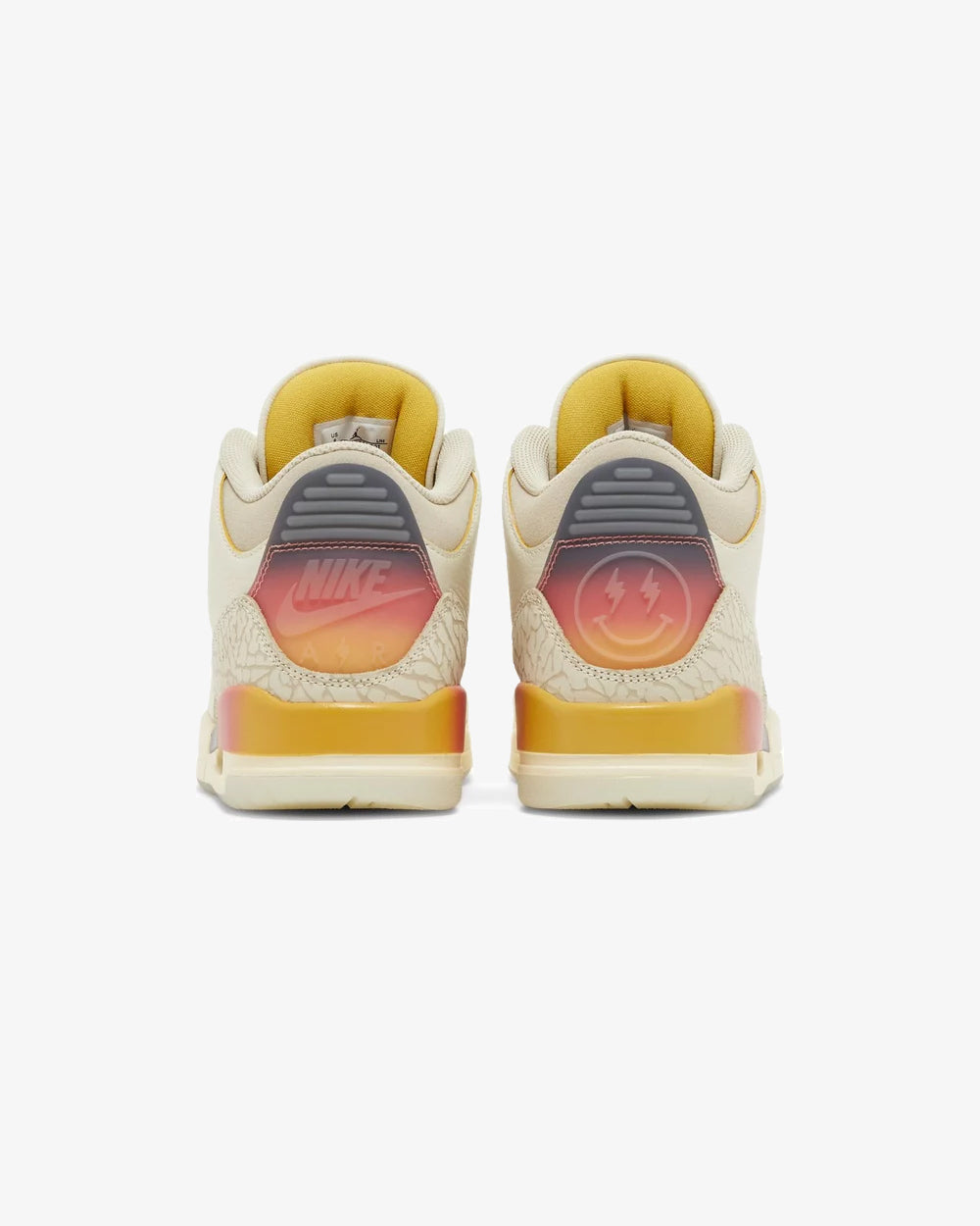 The J Balvin x Air Jordan 3 Retro 'Medellín Sunset' reunites the creative partners on a tropical colorway of the iconic silhouette. Inspired by the breathtaking sunsets of J Balvin’s hometown of Medellin, Colombia, this special-edition AJ3 sports an ivory-colored leather upper with tonal elephant print overlays at the forefoot and heel. A gradient blend of yellow, orange and dark purple lands on the rear midsole and molded back tab, featuring mismatched Nike branding on the left shoe and J Balvin’s smiley face icon on the right. An embroidered gold Jumpman graces the tongue. Undergirding the sneaker is a blue-tinged translucent rubber outsole.