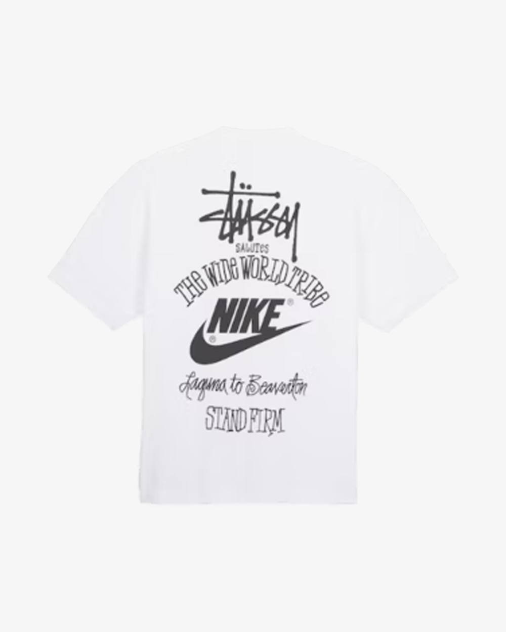 The Nike x Stussy The Wide World Tribe T Shirt White is a collaboration between two iconic brands that showcases a unique design inspired by global travel and exploration. The shirt features a white base color with a bold graphic print on the front that depicts the Nike Swoosh. On the back there are graphics. The back print is accented with Stussy and Nike branding, adding to the shirt's overall aesthetic.
