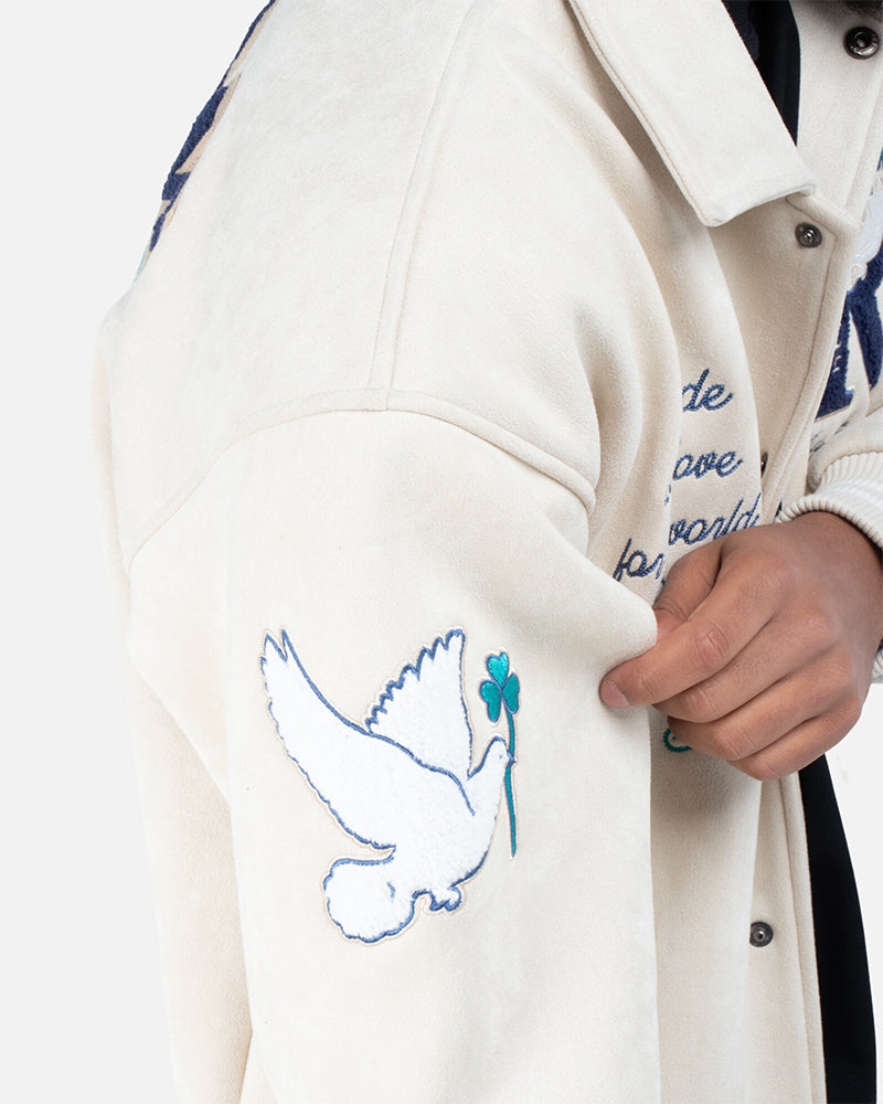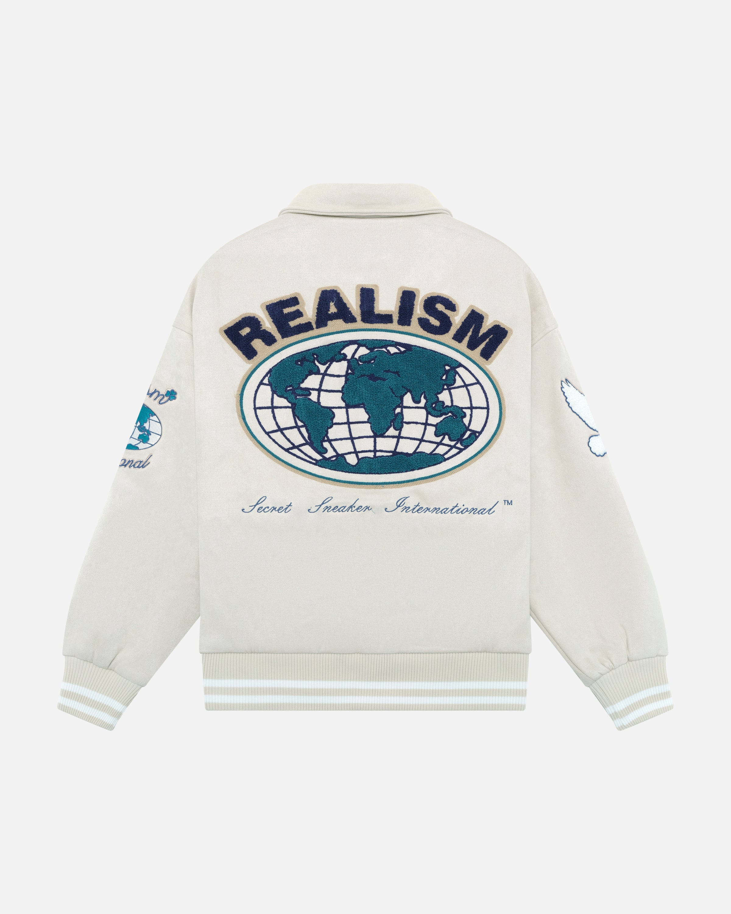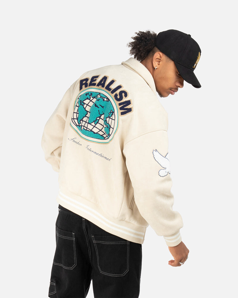 The Realism Worldwide Coaches Jacket takes on a new level of style. Featuring embroidered and chenille appliqués, full snap button up and contrasting trims. The jacket has a full suede construction for that ultra lux finish.