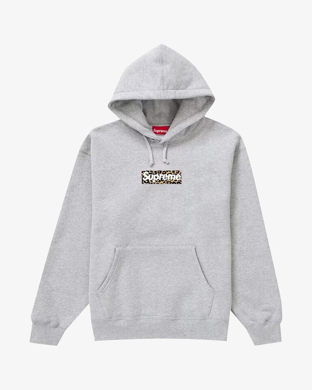 This iteration of the Supreme Shanghai Box Logo Hoodie comes in a heather grey colorway that is dominant throughout. There is a front kangaroo pocket, and the hood has drawstrings for an adjustable fit. As with all their box logo hoodies, this one had a small box logo on the front, with "Supreme" appearing in white text inside a leopard-print box. The back of the hoodie is void of any designs, allowing for a minimalistic look. The cotton material of the sweatshirt allows for comfort and heat retention for the wearer.