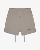 The FOG Essentials Taupe Sweat Shorts feature a relaxed fit, rubber and reflective "ESSENTIALS" branding on the front, and an elastic waistband with long drawstrings.