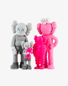 The KAWS Family figures set features the popular Chum, Companion and BFF figures standing together side by side. The pink and grey tone figures show two Companion figures with one holding a small Chum character while the other side shows a 13.3 inch BFF figure with his arm wrapped around the Chum character.