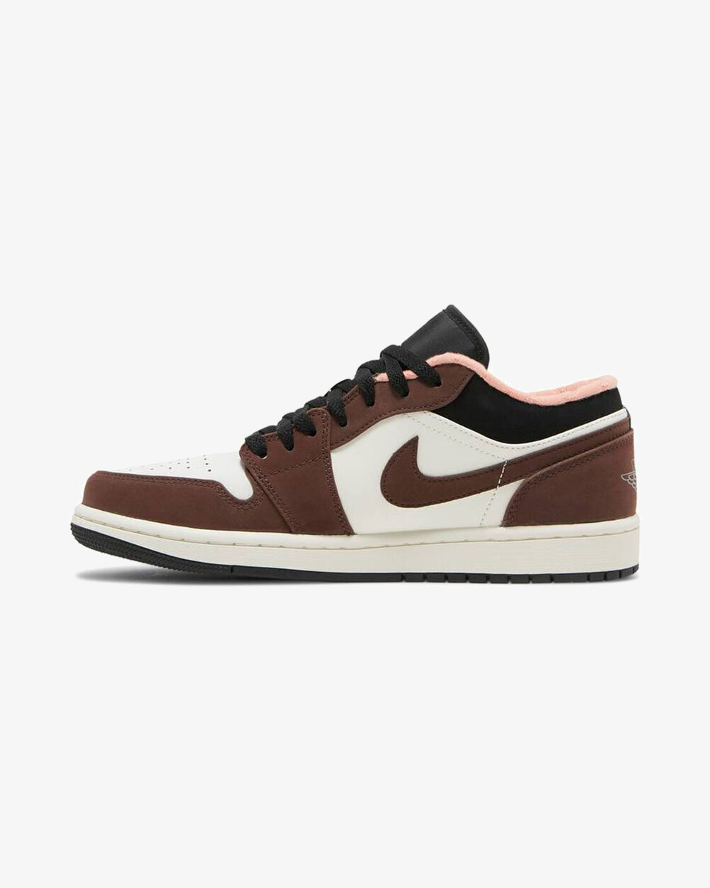 The Air Jordan 1 Low ‘Mocha’ adds refreshed details to a low-profile silhouette modeled after the 1985 original. The upper combines a white leather base with brown suede overlays and a black nylon tongue, the latter accented with a pink embroidered Jumpman. The same pastel hue is applied to the collar lining, featuring soft quilted textile for a cozy fit. A reflective heel tab offers improved visibility in low-light conditions. The low-top is mounted on a standard rubber cupsole, enhanced with an Air-sole unit encapsulated in a lightweight foam wedge.