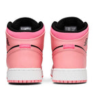 The Jordan 1 Mid Coral Chalk features an array of pink tones alongside black leather. The boldest shade of pink animates much of the toe and mid-foot lace guards, while lighter rose tones cover most of the remaining overlays across the profiles. Toe box and mid-foot panels deviate from their surroundings in stark “Black” contrast, as do the tongue, collar lining and “Wings” insignia on the lateral ankle flap.