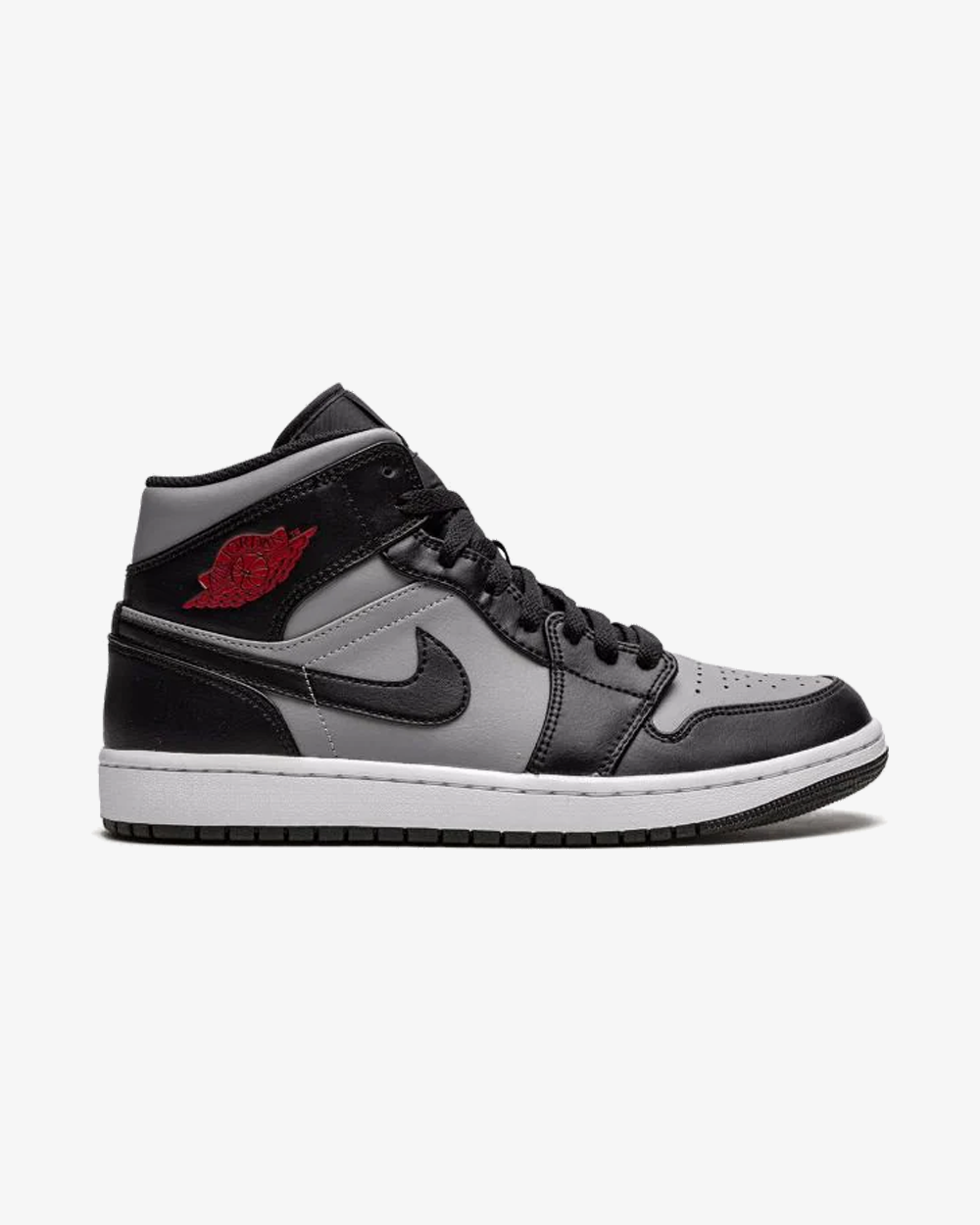 The Jordan 1 Mid Shadow Red features a grey smooth leather upper with black overlays and Swooshes. At the collar, a debossed red Air Jordan Wings logo nods to the original Air Jordan 1 design. From there, a woven Jumpman tongue tag, white midsole, and black outsole complete the design.