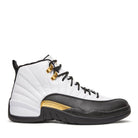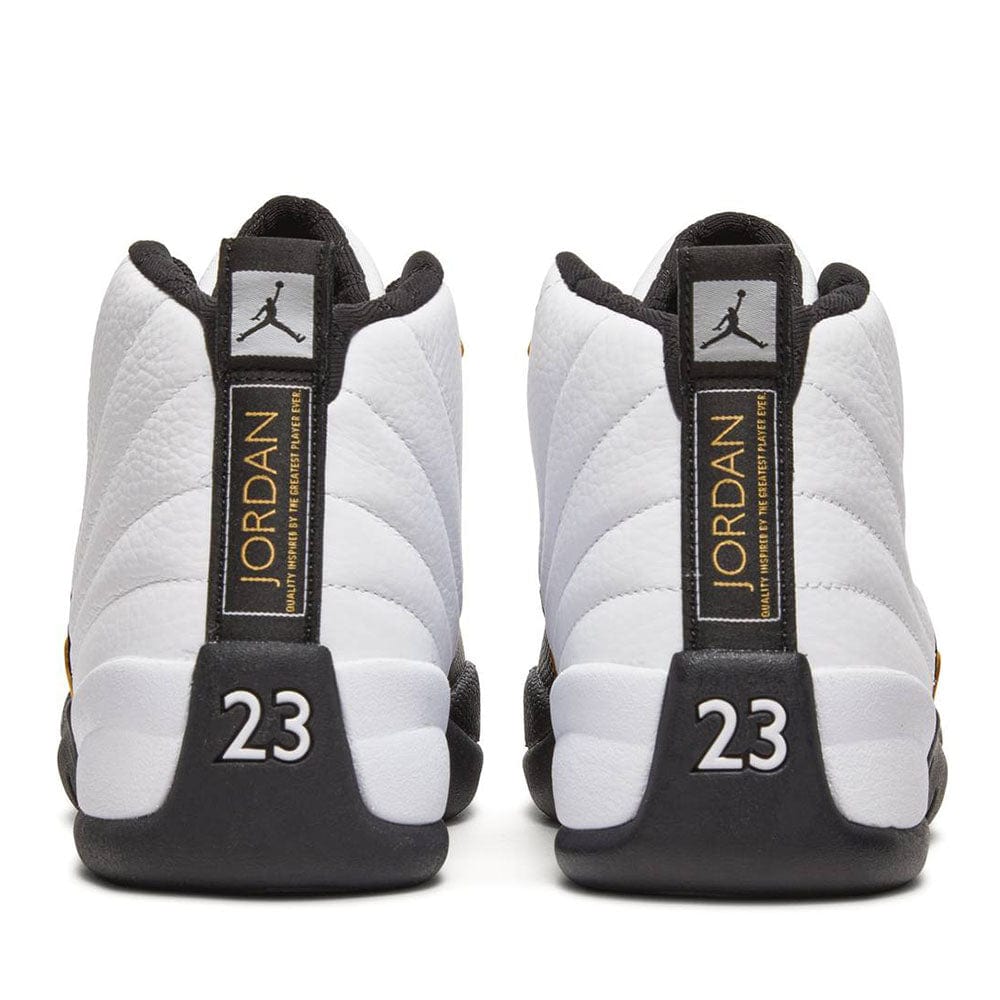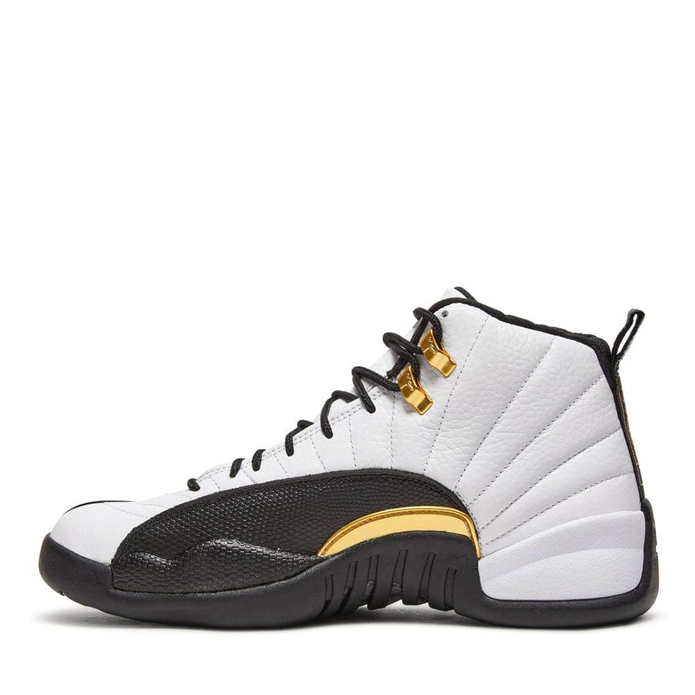 The Air Jordan 12 Retro ‘Royalty’ adds gilded accents to a two-tone design reminiscent of the OG ‘Taxi’ colorway from 1996. The mid-top makes use of a white tumbled leather upper with radiating stitch detailing and black lizard-textured overlays. Contrasting pops of metallic gold land on the molded top eyelets, midfoot TPU piece and the Jumpman and ‘Two 3’ branding embroidered atop the tongue. Responsive cushioning comes courtesy of a full-length Zoom Air unit. Underfoot, the outsole features rubber herringbone traction pods and a carbon fiber spring plate.