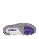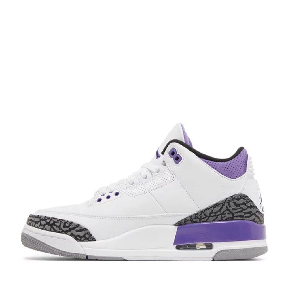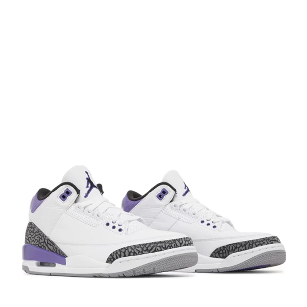The Air Jordan 3 Retro ‘Dark Iris’ brings a revitalized color palette to the hardwood classic that introduced visible Air cushioning to the Jordan franchise. The sneaker utilizes a white tumbled leather upper with signature elephant print overlays in a dark grey finish. Violet accents make their way to the eyelets, perforated collar and the rear of the polyurethane midsole. Jumpman branding hits adorn the leather tongue and molded heel overlay. Underfoot, a grey rubber outsole provides durable traction.