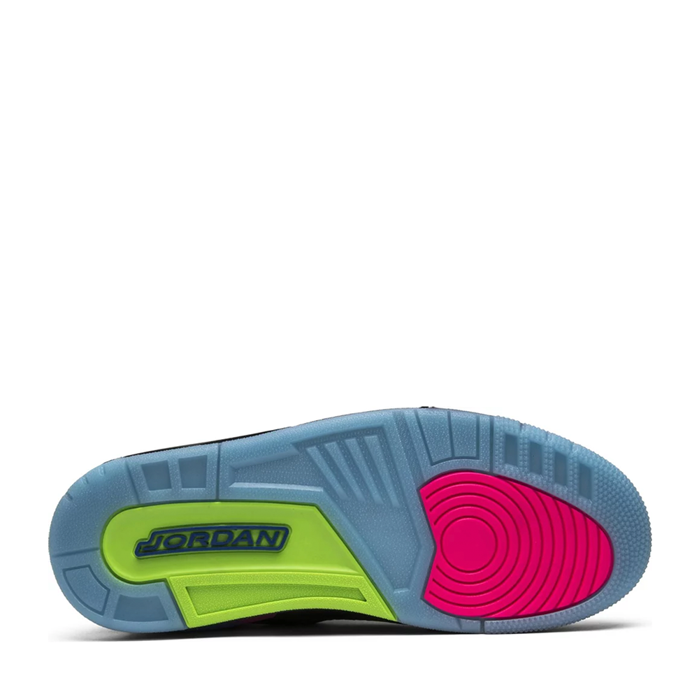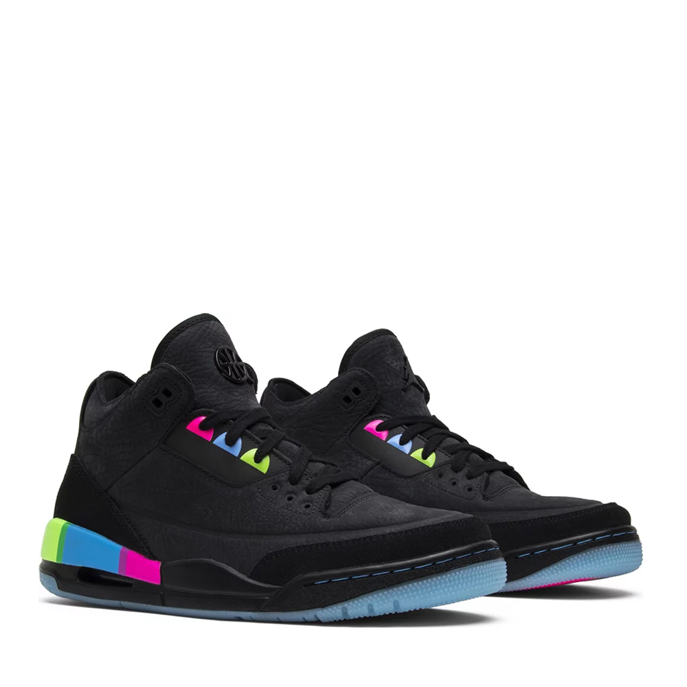 The iconic Jordan 3 taps into the brand’s annual Quai 54 basketball tournament in Paris for a premium rendition that features a black tumbled leather application throughout the upper. Rich suede accents on the toe and heel replace the usual cement print that’s become synonymous with the shoe, while green, pink and bright blue accents line the eyelets and midsole stabilizer. An icy blue outsole contrasts the all-black midsole.