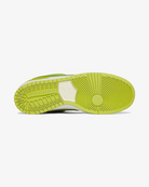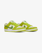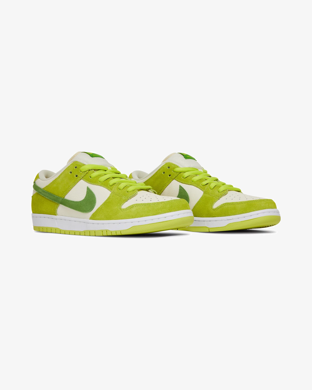 As part of the 2022 Nike SB Fruit Pack, the Nike SB Dunk Low Green Apple features an off-white tumbled leather upper with suede candy apple green overlays and Swooshes. On the inside face of the tongue, a woven label depicting a cartoon-style apple character adds a playful look to the silhouette. From there, a cushioned Zoom Air sole completes the design.