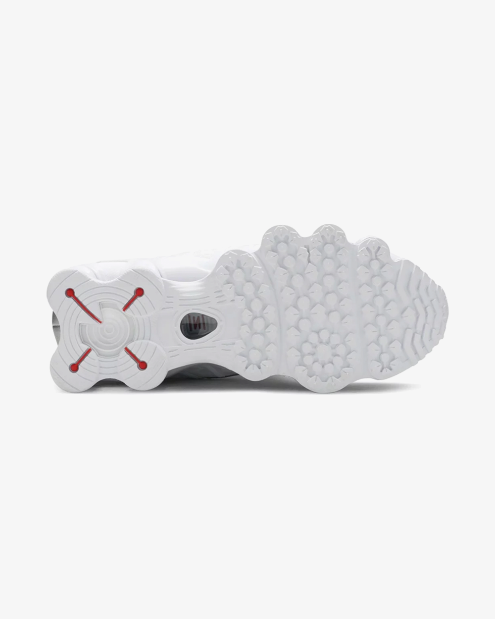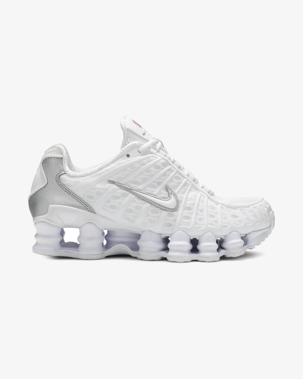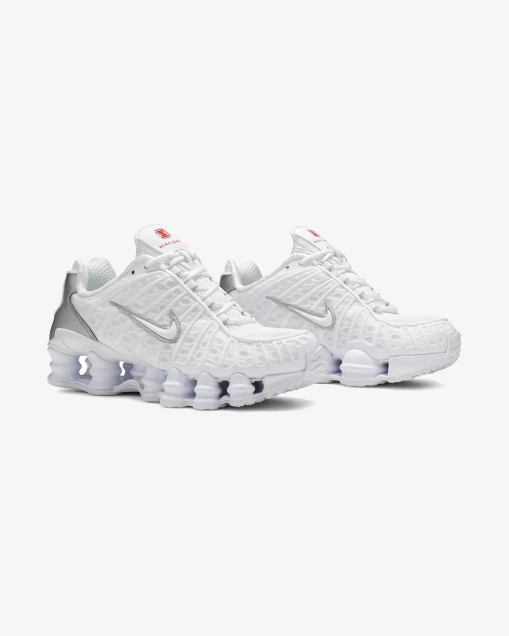 The Nike Shox TL White Metallic Silver features an ivory and silver mesh upper with white synthetic overlays and metallic silver Swoosh silhouettes on both sides. From there, pearl white shock absorbers on the outsole and glossy silver heel strips complete the design.