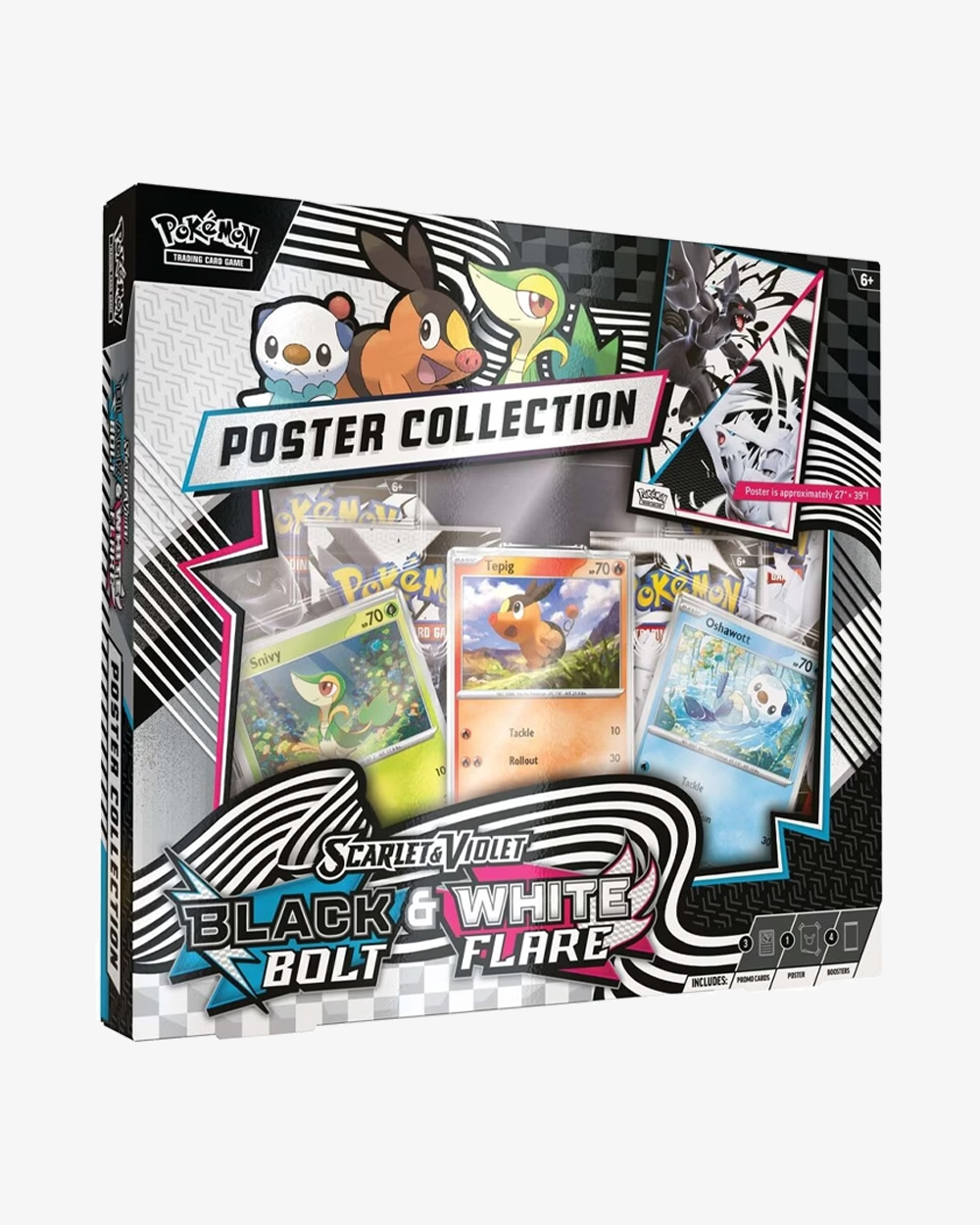- Includes 3 x foil promo cards featuring Snivy, Tepig and Oshawott, 1 x double-sided poster, 68cm × 99cm, 2 x Pokemon TCG: Scarlet and Violet - Black Bolt booster packs, 2 x Pokemon TCG: Scarlet & Violet - White Flare booster packs and 1 x code card for Pokemon TCG Live