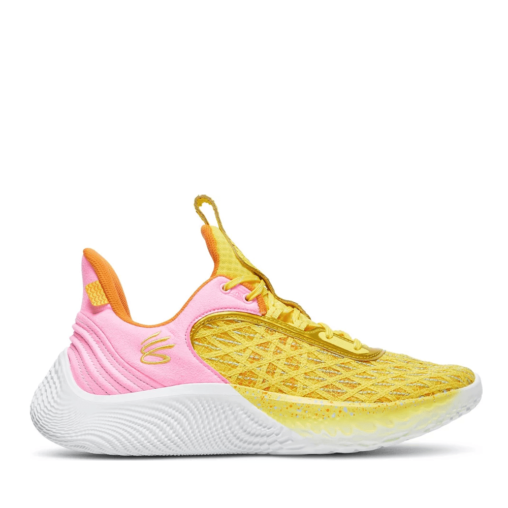 he Curry Flow 9 ‘Play Big’ represents one of seven colorways that make up the ‘Street Pack,’ a footwear collection inspired by iconic characters from the long-running PBS program ‘Sesame Street.’ This pair pays homage to Big Bird, highlighted by a yellow UA Warp upper built with ventilated mesh and textile. A wraparound nubuck overlay is rendered in a pastel pink finish and accented with Steph Curry’s personal logo, along with a small graphic tag displaying Big Bird’s yellow feathers. Lightweight cushioning is provided by a UA Flow sole unit, carried over from the Curry Flow 8 and updated with a revised traction pattern.