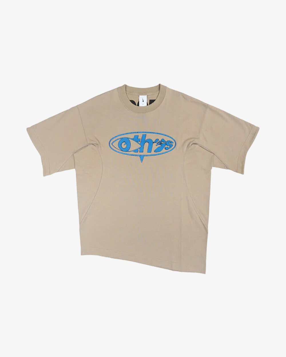 Beige cotton blend T-shirt from Nike x Off-White featuring asymmetrical hem, Ethos motif printed on chest, ribbed crew collar, collaborative Off-White x Nike logo is printed on the back, roomy silhouette, short sleeves