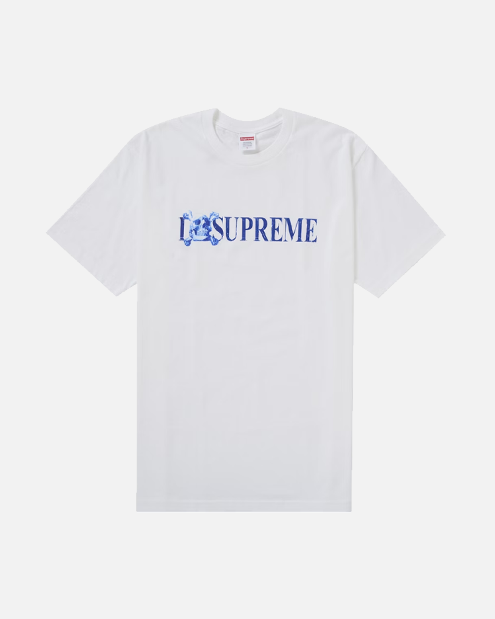 The front of the tee features a detailed skull graphic that captures Supreme’s edgy streetwear aesthetic. The artwork is printed across the chest, combining sharp detailing with a strong visual presence that contrasts against the crisp white base of the shirt.