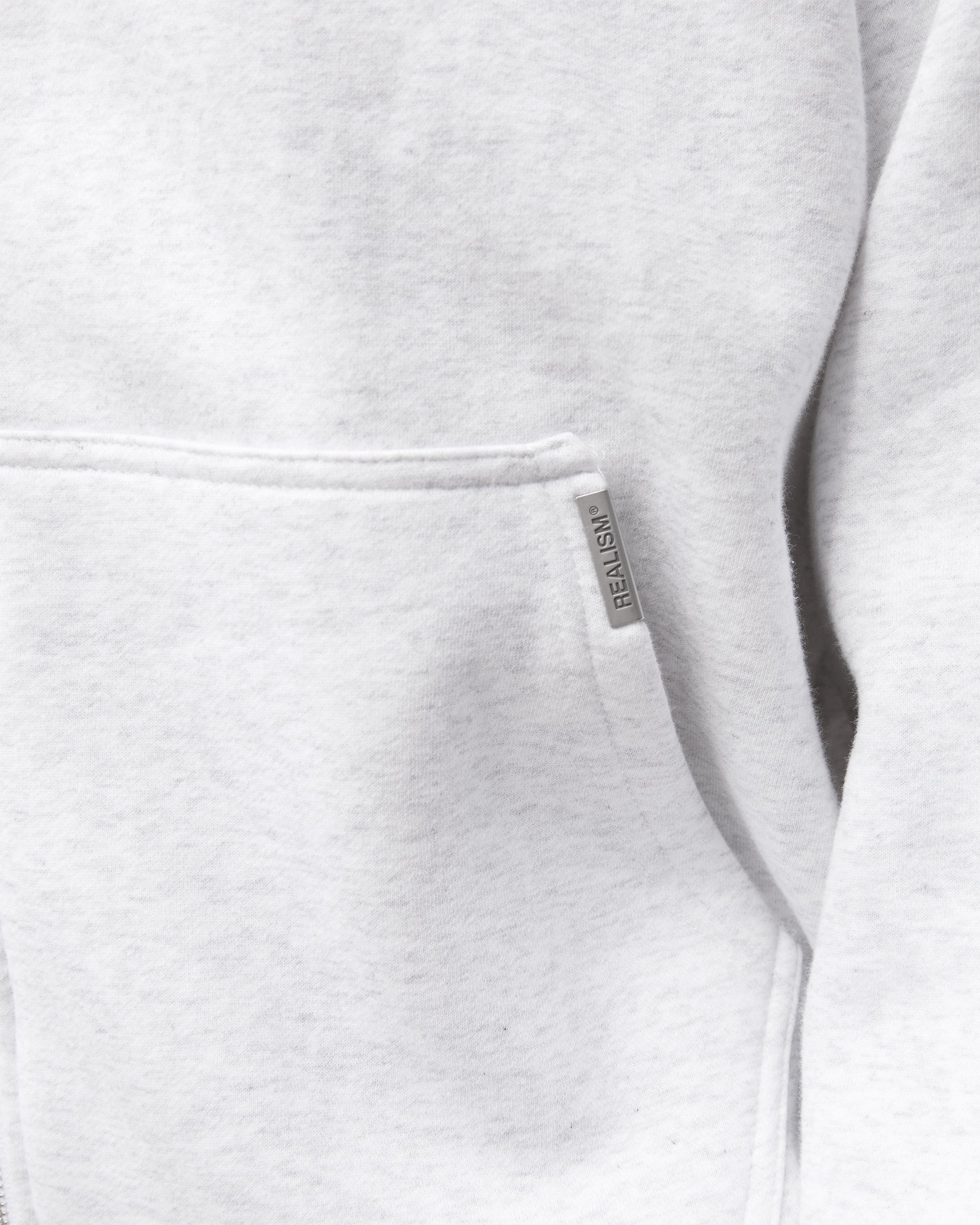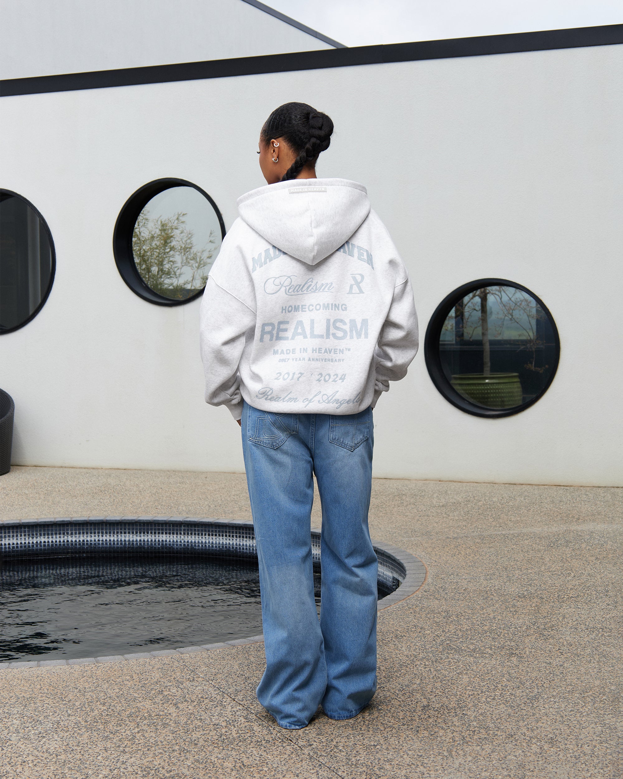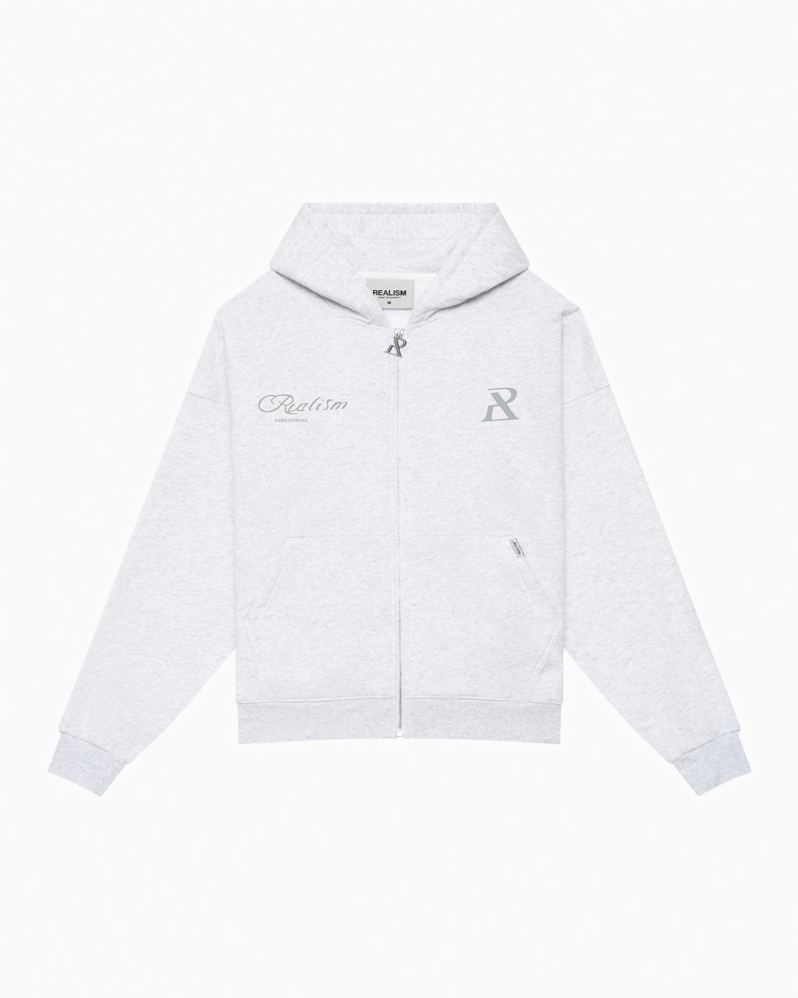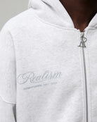Refreshed with a deluxe signature from the Homecoming Collection. Crafted from Realism’s signature 350gsm fleece in a timeless Snow Marle guise, this oversized hoodie features a custom “R” branded zip and detailed anniversary graphics that commemorate the Realism journey from 2017 to 2024.