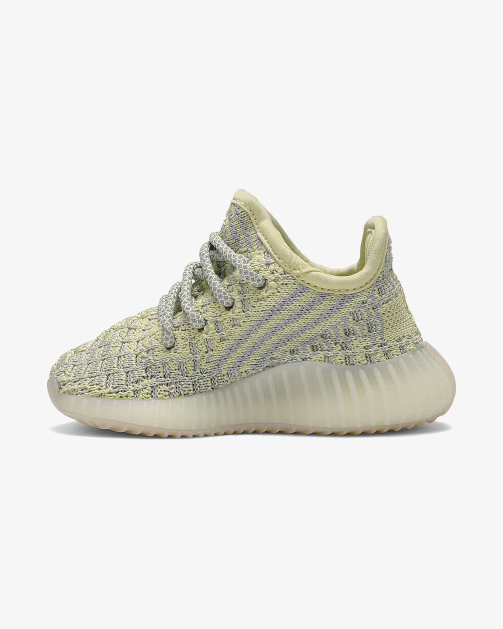 The adidas Yeezy Boost 350 V2 Infant 'Antlia Non-Reflective' formats the June 2019 release for little feet. The 'Antlia' colorway, both in reflective and non-reflective iterations, was exclusively released in Europe. This infant-sized take includes a Primeknit upper with a semi-translucent window at the lateral, much like the original 350 V2 released in 2016. For an update, this shoe does without the heel tab and casts the upper in a pale yellow-green tone. Full-length Boost cushioning promotes comfort within a TPU cage, underscored by rubber tread.