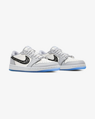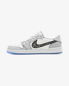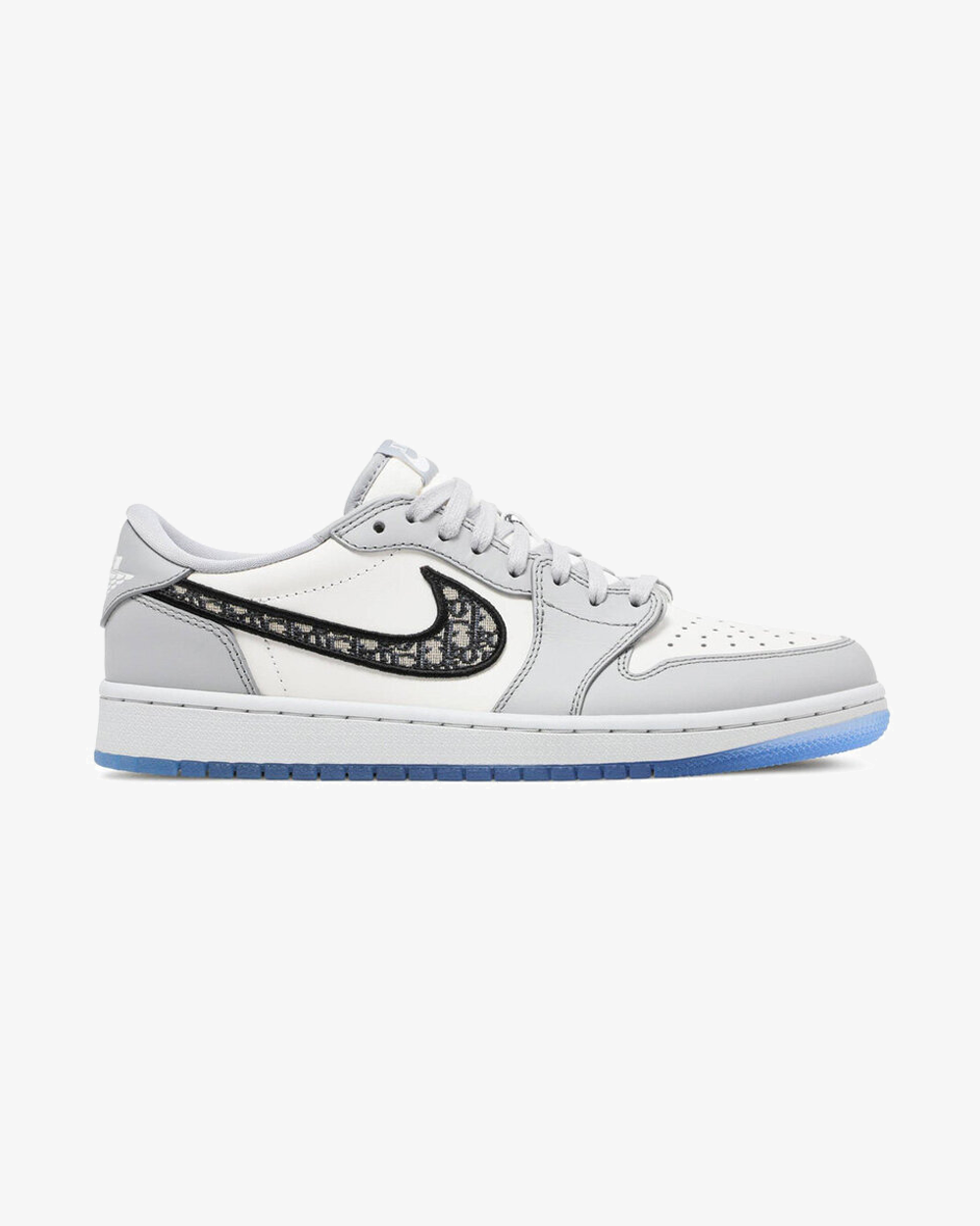 Launching as part of a larger collection with the esteemed Parisian fashion house, the Dior x Air Jordan 1 Low sports a simple two-tone color scheme on the upper, featuring a white Italian leather base with subtle grey leather overlays. Branding elements include a Dior Air woven tongue tag, Dior Oblique jacquard Swoosh and a Dior Wings logo on the heel tab. The made-in-Italy kicks are finished with translucent outsoles revealing additional branding hits underneath.