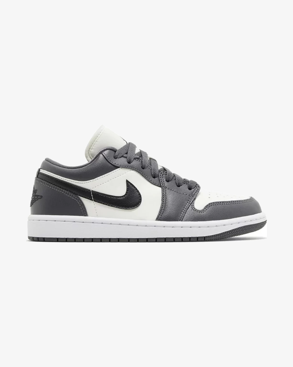 Presented in Sail, Off Noir, Dark Grey, and White colors, the Air Jordan 1 Low boasts a full leather make, featuring toe box perforations for breathability. Mesh tongues and inner lining enhance comfort. The design showcases a Sail base with Dark Grey overlays and eyestays. Notably, Off Noir accents the branded Swooshes, Jumpman logos, and Wings embroidery on the heels. The look is finished with a White midsole and Grey rubber outsole.