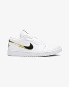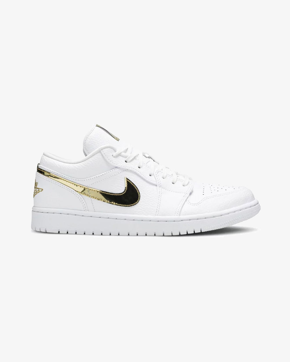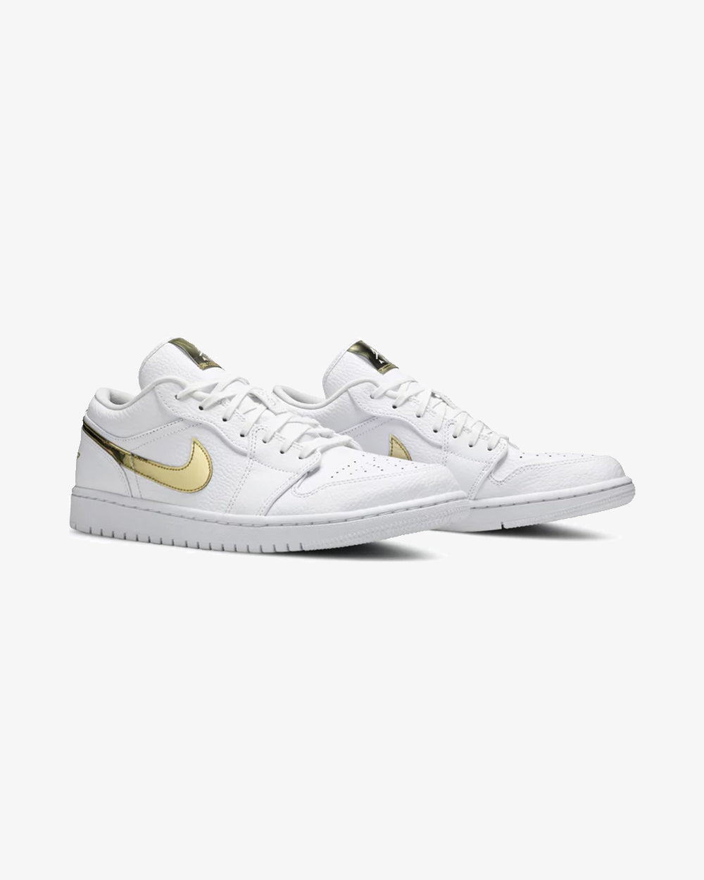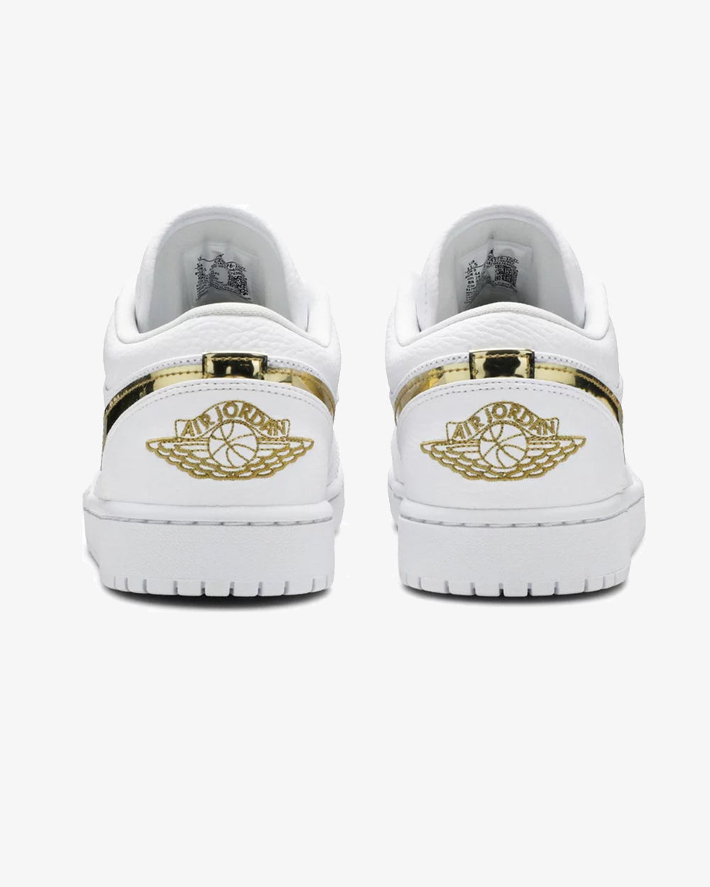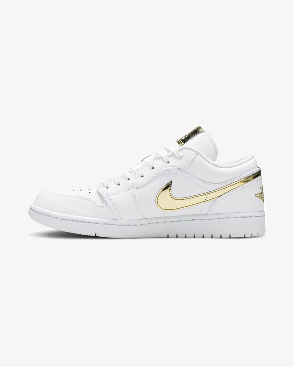 The Nike Air Jordan 1 Low WMNS in White Metallic Gold, a sleek and iconic sneaker featured in a metallic gold and white colour scheme. The metallic gold accents on the Swoosh, Wings logo, and tongue add a touch of luxury and elevate the overall aesthetic of the shoe.