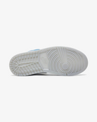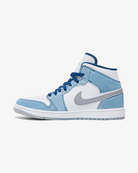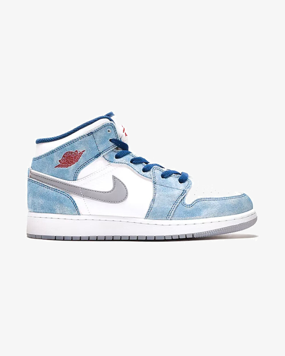 The Air Jordan 1 Mid SE GS ‘French Blue’ showcases a weathered aesthetic, highlighted by a white leather upper with suede overlays in a faded blue finish. A light grey Swoosh is sharply contrasted by a crimson Jumpman on the tongue and a color-matched Wings logo on the lateral collar flap. The mid-top rests on a traditional rubber cupsole, featuring an encapsulated Air-sole unit in the heel and a grey rubber outsole underfoot.