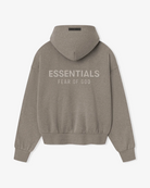 The Classic Hoodie is made from 380gsm core fleece to provide ideal comfort and structure. The hoodie features a classic fit with signature Fear of God relaxed proportions. A new "Essentials Fear of God" beveled metallic logo is branded across the back. Details include a double-layer hoodie, kangaroo pocket, rib-knit cuffs and waist-hem. A "Fear of God Essentials" rubberized label is stitched on the hood and sleeve.