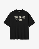The 90's Tee is made from medium-weight 100% cotton jersey. The crewneck tee features a 90s fit with oversized proportions and dropped shoulders. Branding includes a "Fear of God State" screen-printed logo on the front and a Fear of God Essentials rubberized label at the back collar.
