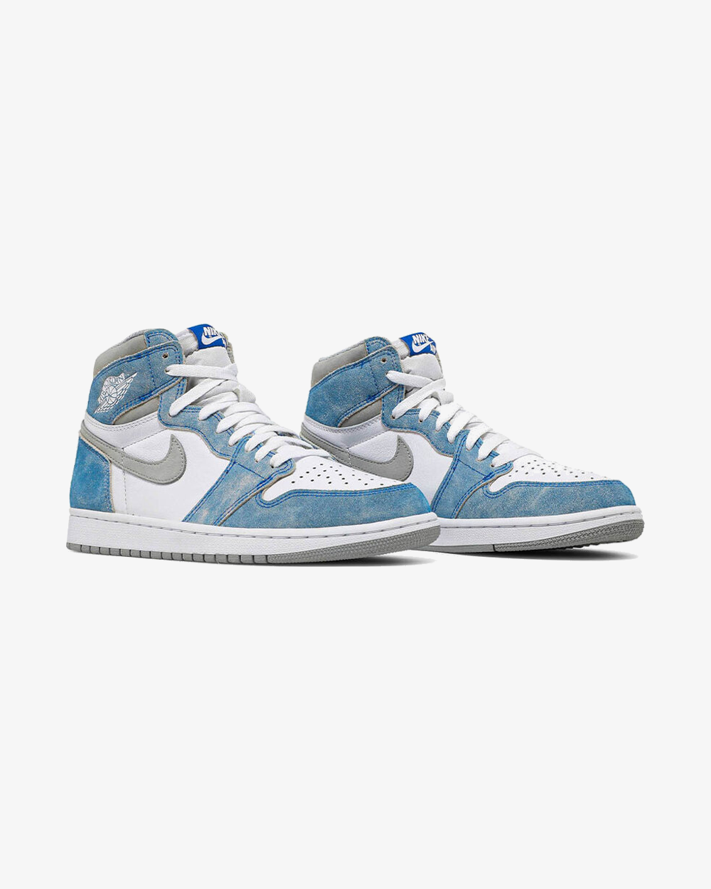 The Air Jordan 1 Retro High OG ‘Hyper Royal’ takes on a weathered aesthetic, highlighted by a white leather upper with faded blue suede overlays. Contrasting neutral grey hits land on the Swoosh and padded collar, adding to the sneaker’s understated palette. OG branding elements include a Jordan Wings logo on the lateral collar flap and a woven Nike tongue tag. The high-top is mounted on a standard AJ1 rubber cupsole, featuring encapsulated Nike Air cushioning in the heel.
