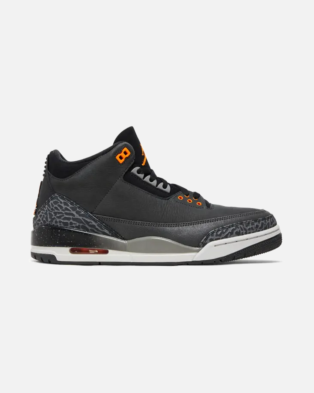 Dressed in a Night Stadium / Total Orange / Black colour palette, the sneaker features a dark grey nubuck upper paired with tonal elephant print overlays on the toe and heel—signature elements of the Air Jordan 3 silhouette.