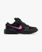 RTFKT, creator of digital sneakers and collectibles, teams up with parent company Nike on the Dunk Genesis ‘Void,’ a futuristic take on the ‘80s hoops shoe that debuted in 2022 as an NFT. Treated to a stealthy black finish, the upper combines a synthetic base with canvas overlays at the forefoot and heel. A signature Swoosh in bright violet stands out on the lateral side, while a color-matched RTFKT blade logo adorns the medial side. The sneaker can be customized via removable modular pieces on the tongue and back tab. Nike’s springy Zoom cushioning is housed in a chunky midsole with debossed RTFKT branding on the lateral sidewall.