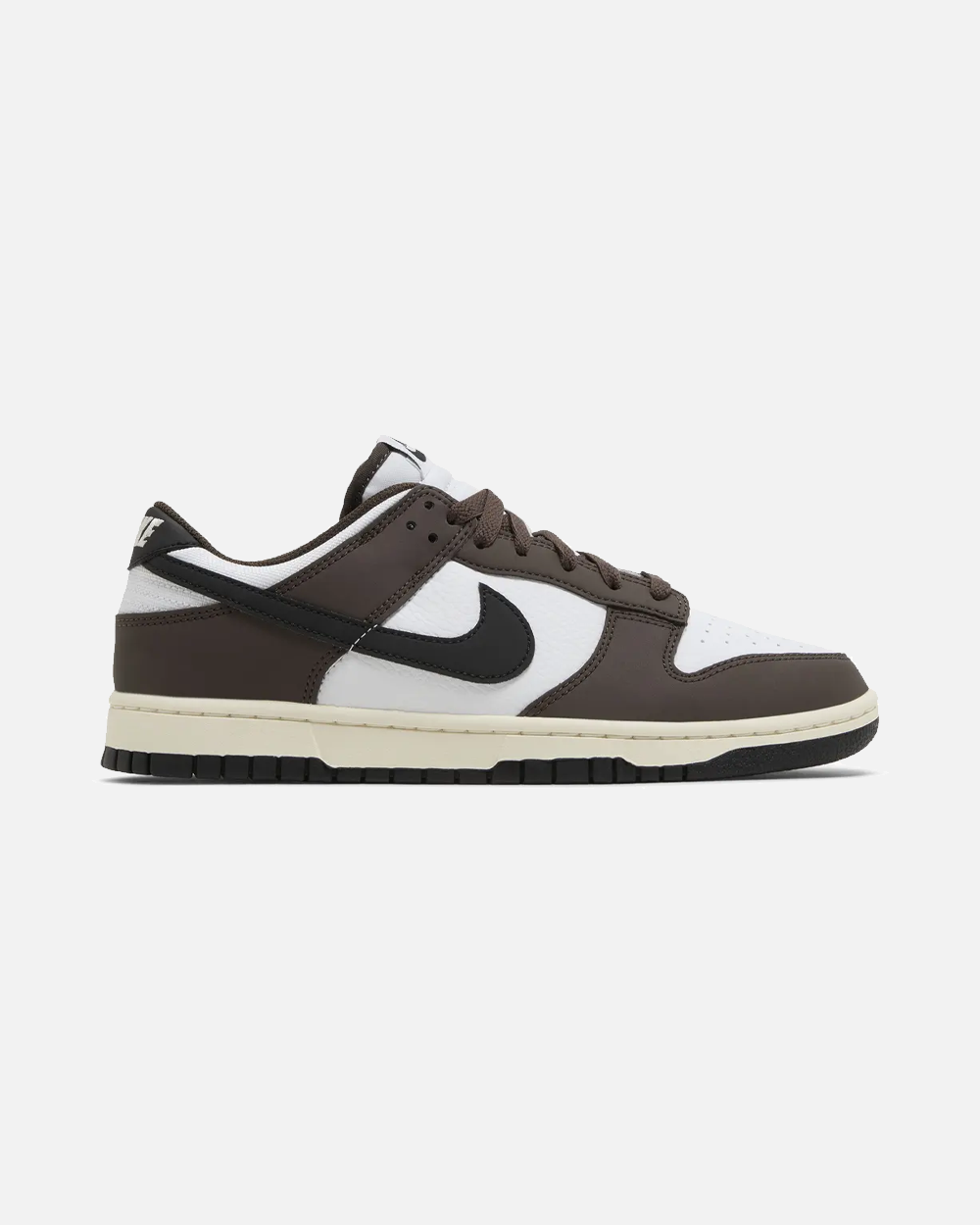 The Nike Dunk Low Next Nature 'Baroque Brown' features a white tumbled leather upper with white mesh construction on the collar and smooth brown leather overlays at the forefoot and heel. Black leather accents make their way to the signature Swoosh and back tab, marked with embroidered Nike branding. Inside the shoe, the insole displays Nike's retro Sunburst logo, indicating a sustainable build composed of at least 20% recycled content. An aged off-white finish is applied to the midsole, supported underfoot by a grippy black rubber outsole.
