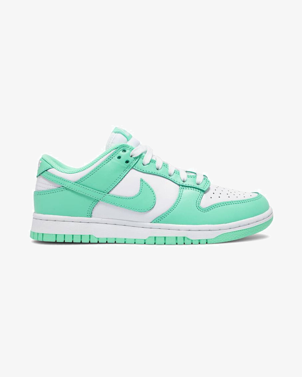 The Nike women’s Dunk Low ‘Green Glow’ showcases traditional color blocking on a customary all-leather build. A crisp white base is contrasted by a vibrant shade of green on the sneaker’s eyestay, Swoosh, and forefoot and heel overlays. The verdant hue is repeated on the woven tongue tag and heel tab, both marked with standard Nike branding. The low-top rides on a two-tone rubber cupsole, equipped with a grippy outsole originally designed for pivoting on the hardwood.